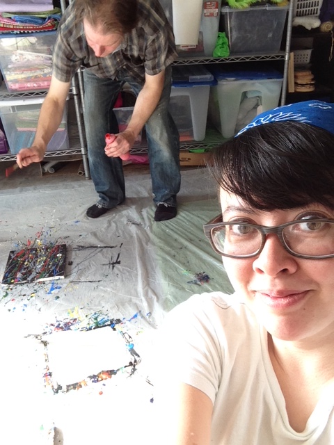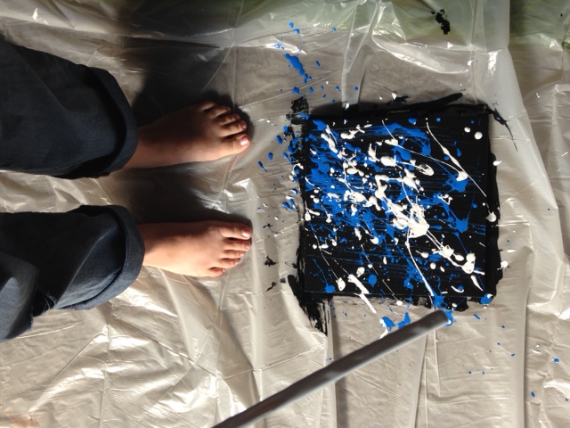 Today was Day SIXTEEN and it was a total treat because I not only had a special guest star painter, but two! My friends Karli and John both painted their own paintings with me today! AND the artist was Jackson Pollock so it was going to be a blast! Or a splat! We tarped off a huge portion of the art space and went paint crazy.