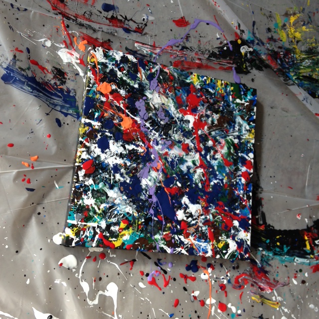 the last moment came where I decided to stop using the same 5 colors. I thought ORANGE and PURPLE! I only did one splatter of each and I knew in my heart that the piece was complete!
