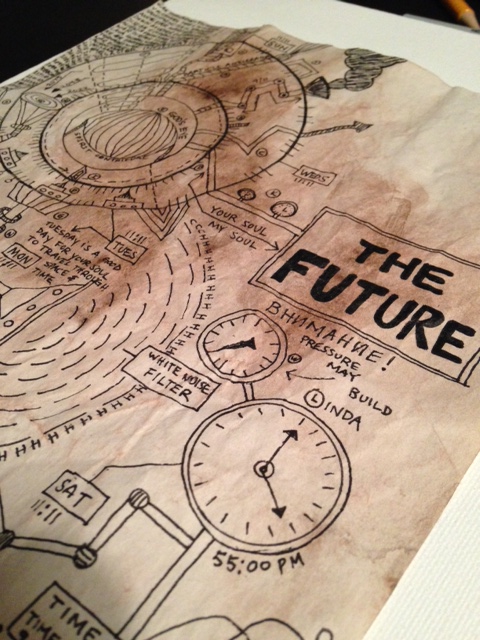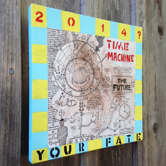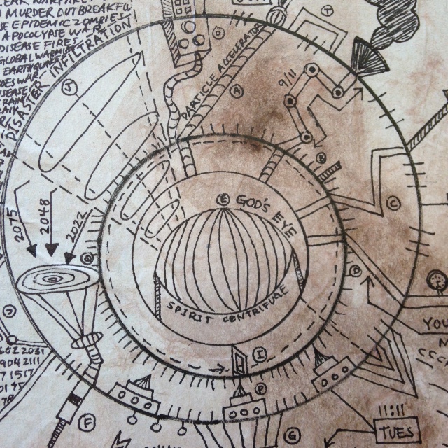 Day Seventeen and I am still coming down from my Pollock high from yesterday. Today was a nice contrast. It was nice to do more pen & ink work and work my mind in different way…a more autistic savant way. I designed the schematics for my time machine! A time machine that filters out disasters as it transports your soul to the right place and time. As I drew this piece, I started to believe that it could actually work…oh no, talk about embodying the essence of the artist.