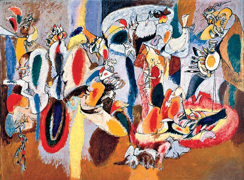 allusions to Gorky’s Armenian past. The work in 1944 shows his emergence in the 1940s from the influence of Cézanne and Picasso into his own style, and is perhaps his greatest work. It is over six feet high and eight feet wide, depicting “an abstract landscape filled with watery plumes of semi-transparent color that coalesce around spiky, thornlike shapes, painted in thin, sharp black lines, as if to suggest beaks and claws.”