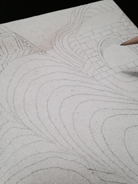 reasons. It’s hard to draw on canvas and his work is very detailed. At first I tried to paste a piece of paper onto the canvas and then attempted to give it a yellowish-brown stain. Everything about that went wrong so I decided just to take the paper off and do a wash onto the canvas. I also didn’t know exactly what I wanted to draw/paint. I went through so many of his drawings until I decided. I was intrigued by his Madonna pictures, but also loved his decorative columns and tunnels. I ended combining a few different ideas. I also was torn about keeping it just pen & ink, but I was too drawn to the drawings he colored so I decided to paint some parts of mine. I feel that I captured Ramirez’s spirit, but I also tried to incorporate some of my own. Hope you enjoy! See you tomorrow! xoxo, Linda