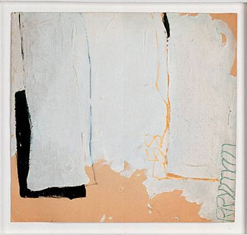series differ in the organization of paper sheets, the configuration of tape traces, and the painted shape. Just as the Classico works were titled after the type of paper used as a medium, the so-called Surface Veil works from 1970 were named for the brand of fiberglass upon which the smaller pieces in this group were painted. Some of the 12-foot square paintings from the series were executed not on fiber-glass but on cotton or linen. In each of these works the pigment appears to form a membrane over the support due to the differing degrees of opacity and translucence in the white paint juxtaposed with areas where less of it has been applied, leaving the fabric exposed. These disruptions in the painting’s skin often mark the literal pauses between the artist’s working sessions.