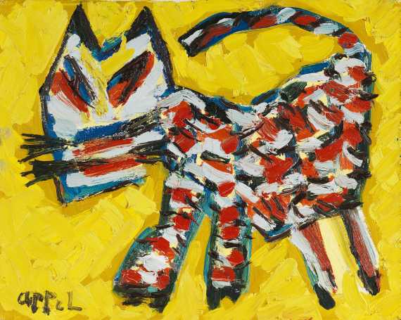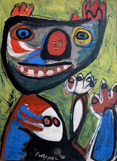 Appel studied at the Rijksakademie van Beeldende Kunsten in Amsterdam during the German Occupation from 1940 to 1943 and it was there he met the young painter Corneille and, some years later, Constant; they became close friends for years. His parents opposed his choice to become an artist, leading him to leave home; this was also necessary because he needed to hide from the German police so that he would not be picked up and sent to Germany to work in the weapon industry. Appel had his first show in Groningen in 1946. In 1949 he participated with the other CoBrA artists in the Stedelijk Museum Amsterdam; this generated a huge scandal and many objections in the press and public. He was influenced by Pablo Picasso, Henri Matisse and the French brute-art artist Jean Dubuffet. In 1947 he started sculpting with all kinds of used materials (in the technique of assemblage) and painted them in bright colors: white, red, yellow, blue and black. He joined the Experimentele Groep in Holland together with the young Dutch painters Anton Rooskens, Theo Wolvecamp and Jan Nieuwenhuys. Later the Belgian writer Hugo Claus joined the group.