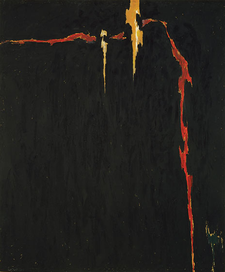 throughout the rest of his career — a large-scale color field applied with palette knives. Among Still’s well known paintings is 1957-D No. 1, 1957, (above), which is mainly black and yellow with patches of white and a small amount of red. These four colors, and variations on them (purples, dark blues) are predominant in his work, although there is a tendency for his paintings to use darker shades.