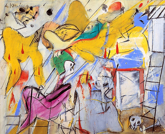 The hallmark of de Kooning’s style was an emphasis on complex figure ground ambiguity. Background figures would overlap other figures causing them to appear in the foreground, which in turn might be overlapped by dripping lines of paint thus positioning the area into the background.