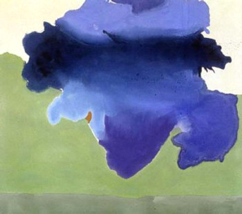 Initially associated with abstract expressionism her career was launched in 1952 with the exhibition of Mountains and Sea. This painting is large – measuring seven feet by ten feet – and has the effect of a watercolor, though it is painted in oils. In it, she introduced the technique of painting directly onto an unprepared canvas so that the material absorbs the colors. She heavily diluted the oil paint with turpentine so that the color would soak into the canvas. This technique, known as “soak stain” was used by Jackson Pollock (1912–1956), and others; and was adopted by other artists notably Morris Louis (1912–1962), and Kenneth Noland (1924–2010), and launched the second generation of the Color Field school of painting. This method would sometimes leave the canvas with a halo effect around each area to which the paint was applied but has a disadvantage in that the oil in the paints will eventually cause the canvas to discolor and rot away.