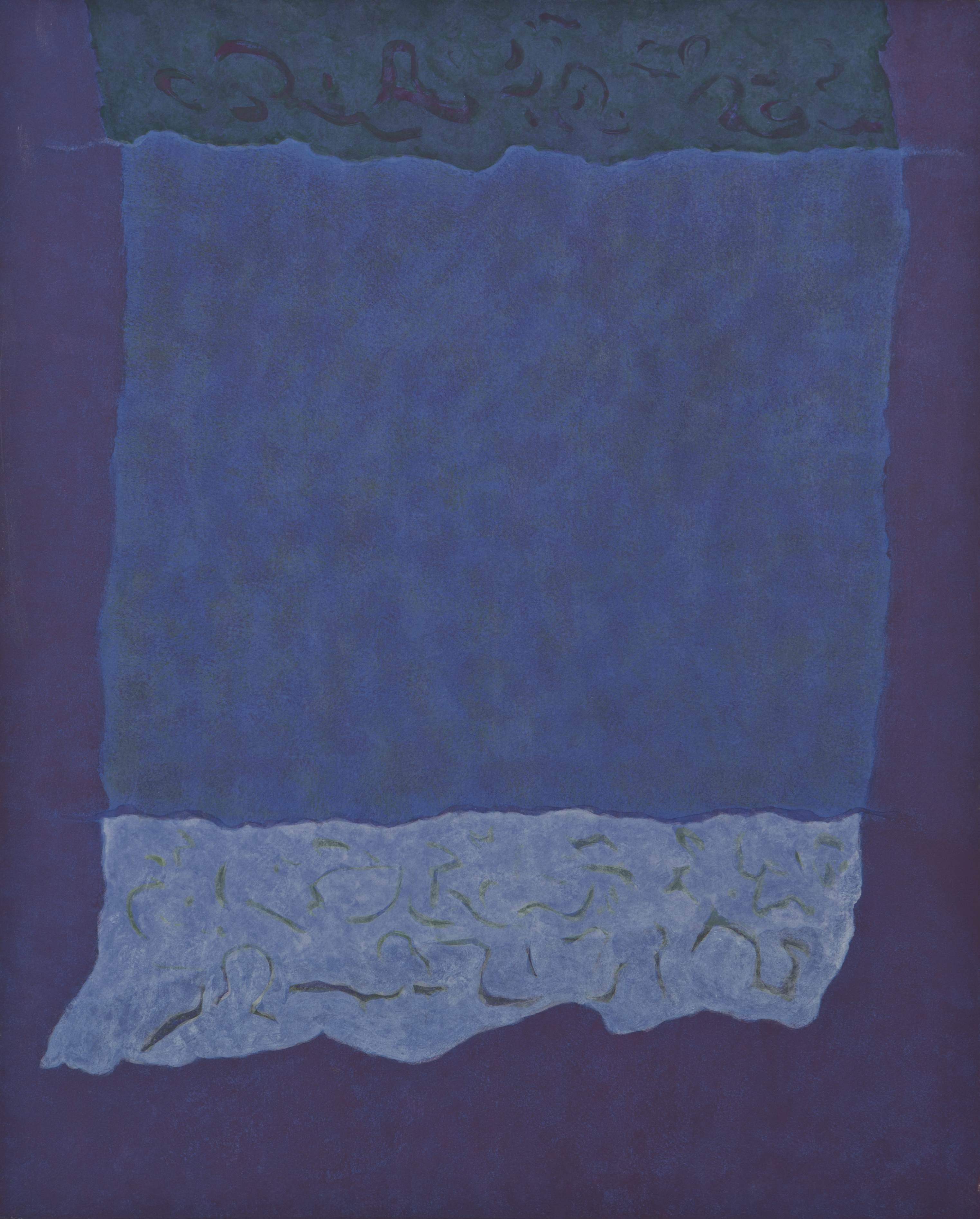 by East Asian aesthetics, he created his Tea House series of paintings, characterized by softly defined geometric forms painted with a limited palette and often overlaid by dark calligraphic brushwork. Later in the 1950s, Stamos worked with compositions that became increasingly reductive and simplified. He explored the use of layers of thin pigment, carefully worked, to create depth in his broad expanses of color.