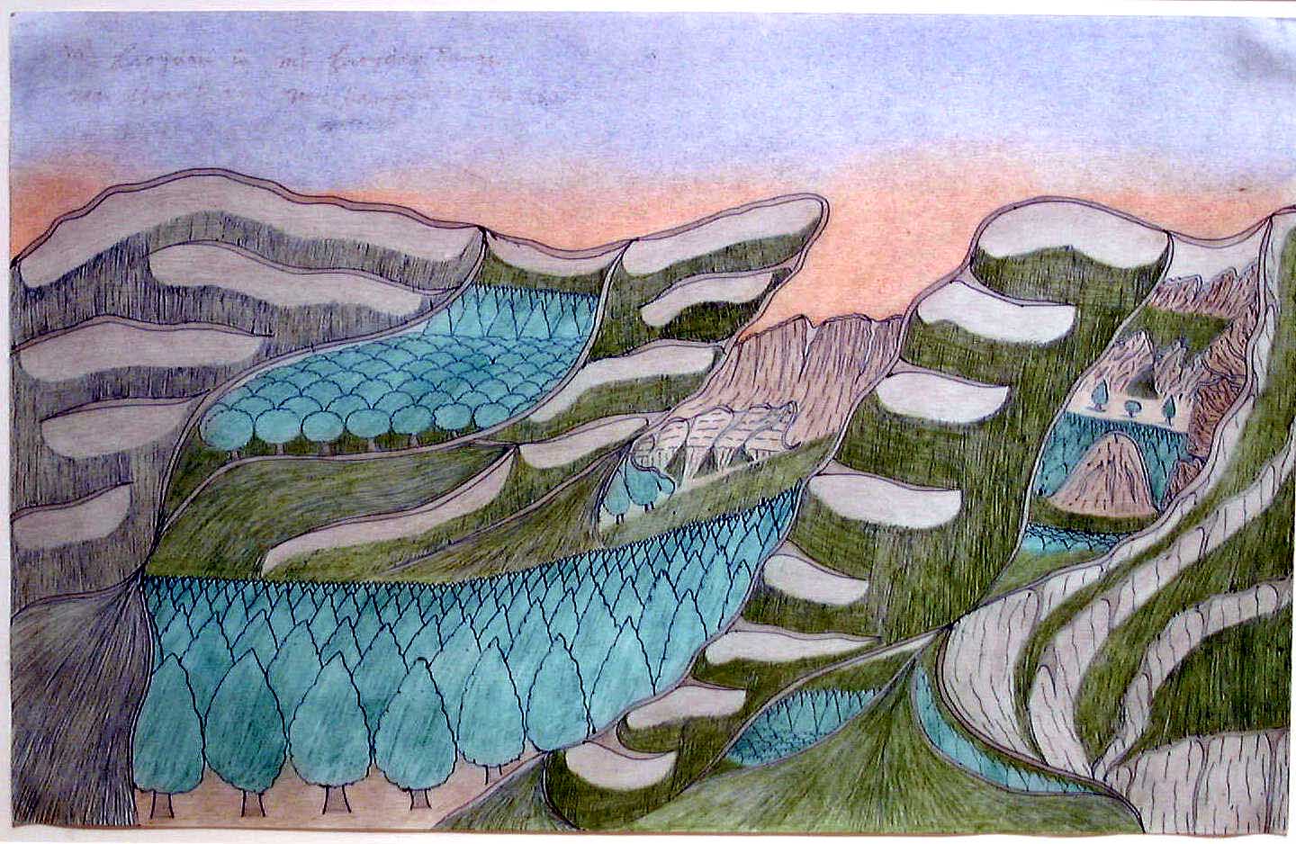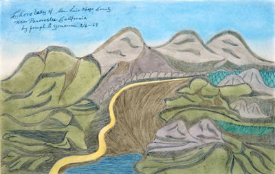 may have begun in the 1940s, but Yoakum stated, “I’ve been drawing all my life…”(1) His pictures frequently show locations or memories of his travels, and he often included the name of the place on the drawing, as well as a stamped date on his vibrant works.