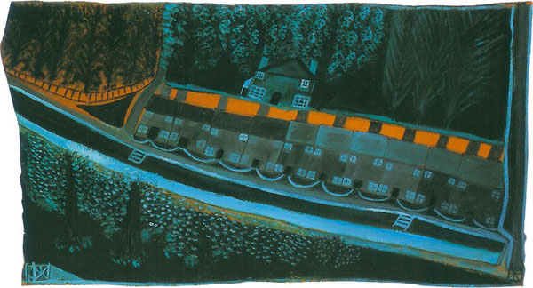 His paintings are an excellent example of naïve art; perspective is ignored and an object’s scale is often based on its relative importance in the scene, giving many of his paintings a map-like quality.