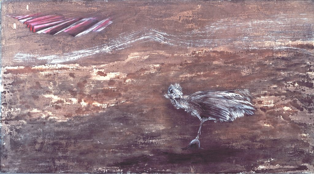 His mid-career works were influenced by East Asian philosophy and mysticism, which he used it as a way of approaching nature directly, avoiding theory. Graves adopted certain elements of Chinese and Japanese art, including the use of thin paper and ink drawing. His painted birds, pine trees, and waves. Graves works, such as “Blind Bird” often contain elements of Mark Tobey, who was inspired by Asian calligraphy. Graves switched from oils to gouaches, his bird became psychedelic, mystic, en route to transcendence. The paintings were bold, applied in a thick impasto with a palette knife, sometimes on coarse feed sacks.