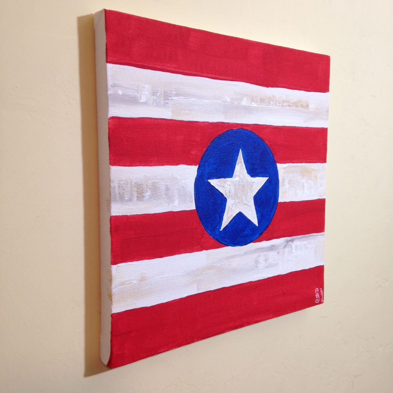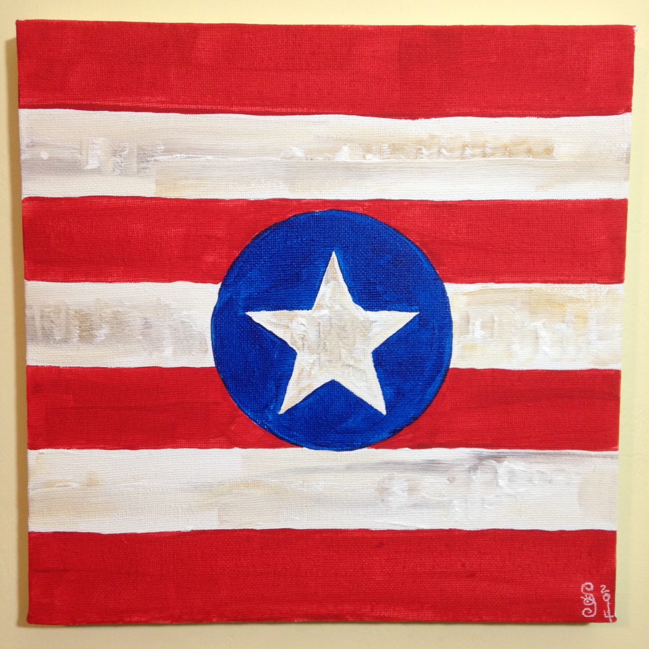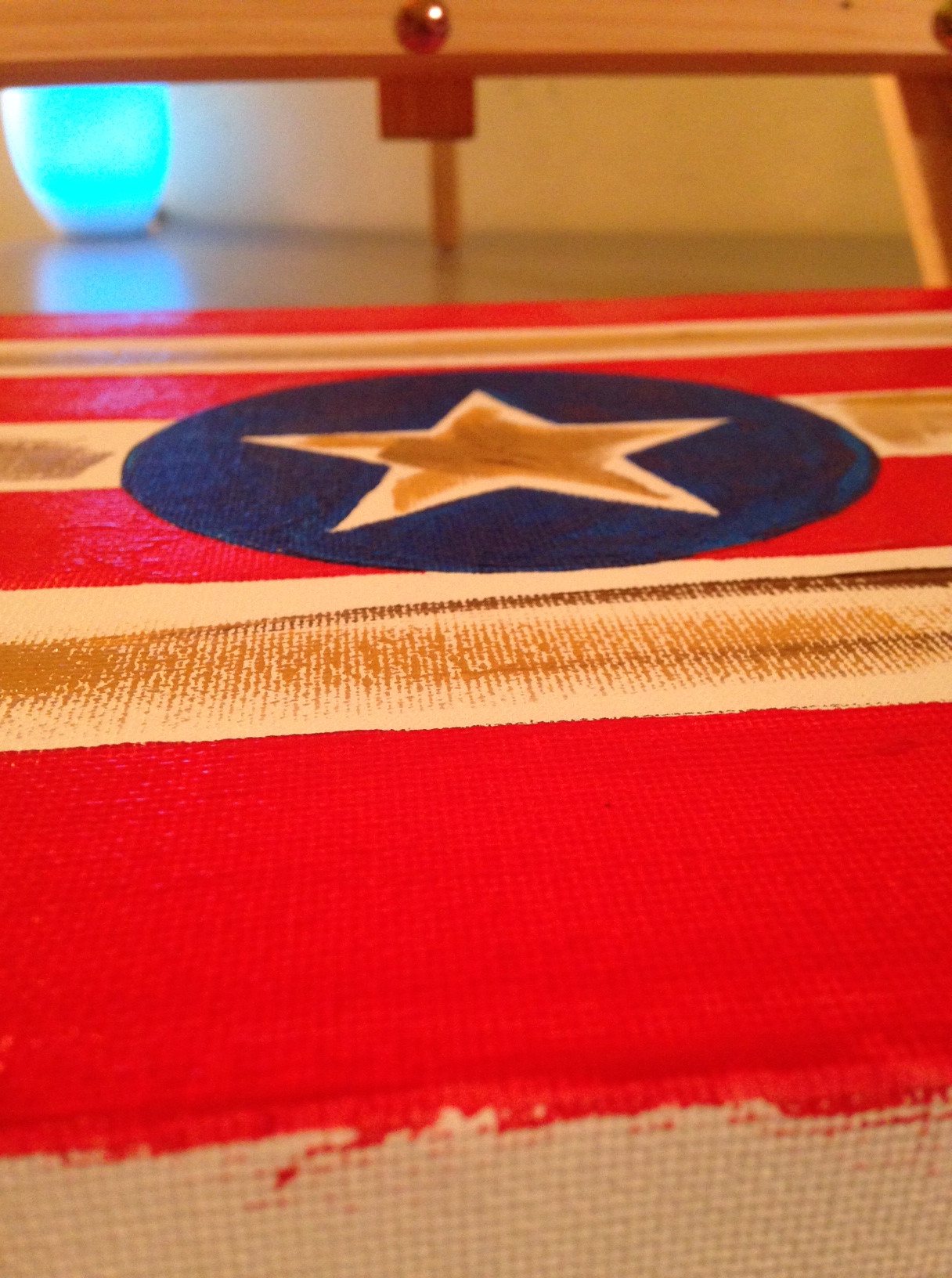 I chose to do my own version of Jasper John’s flag paintings. And then I realized after watching TV today that it embodied Captain America as well…wasn’t trying to accomplish that at all, but okay!