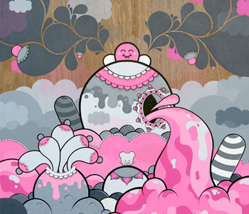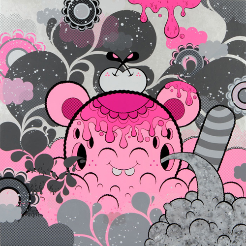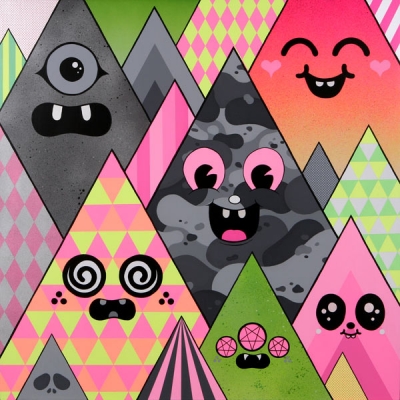 Buff Monster made a name for himself by putting up thousands of hand-silkscreened posters across Los Angeles, and other far-away places. His work is characterized by happy characters living in brightly-colored bubbly landscapes.