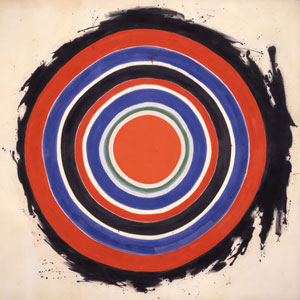 Most of Noland’s paintings fall into one of four groups: circles (or targets), chevrons, stripes and shaped canvases. His preoccupation with the relationship of the image to the containing edge of the picture led him to a series of studies of concentric rings or bullseyes, commonly referred to as targets, which, like the one reproduced here called Beginning from 1958, used unlikely color combinations.