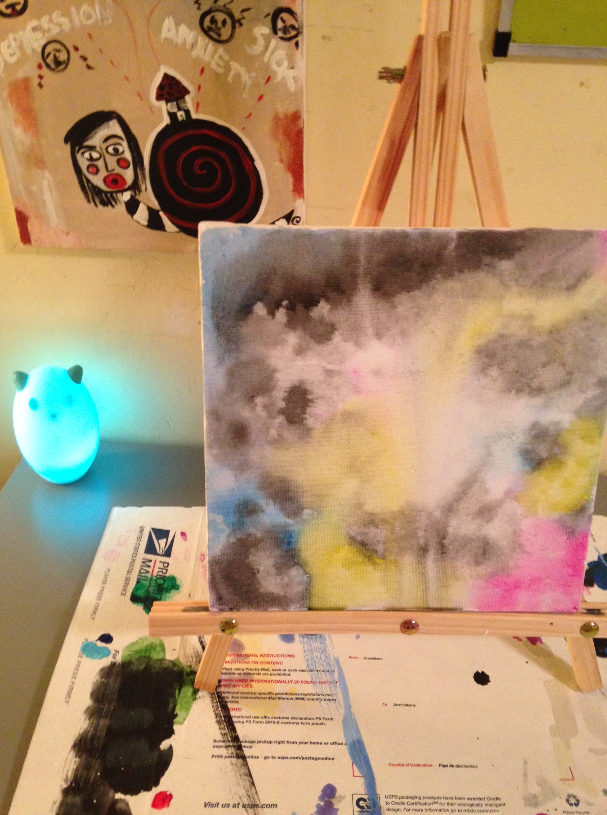 It’s Day 90 and there’s a rainstorm outside.  My dogs were freaking out from the thunder and lightning and I was painting with glitter!  Please join me in celebrating Takashi Murakami today.