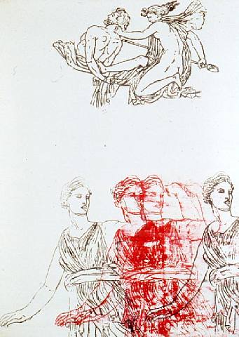 Harnessing a capacious imaginative energy and a ferocious will, Spero continued to mine the full range of power relations. In 1987, following retrospective exhibitions in the United Kingdom, the United States and Canada, the artist created images that leapt from the scroll surface to the wall surface, refiguring representational forms of women over time and engaging in a dialogue with architectural space. Spero’s wall paintings in Chicago, Vienna, Dresden, Toronto, and Derry form poetic reconstructions of the diversity of representations of women from the ancient to the contemporary world, validating a subjectivity of female experience.