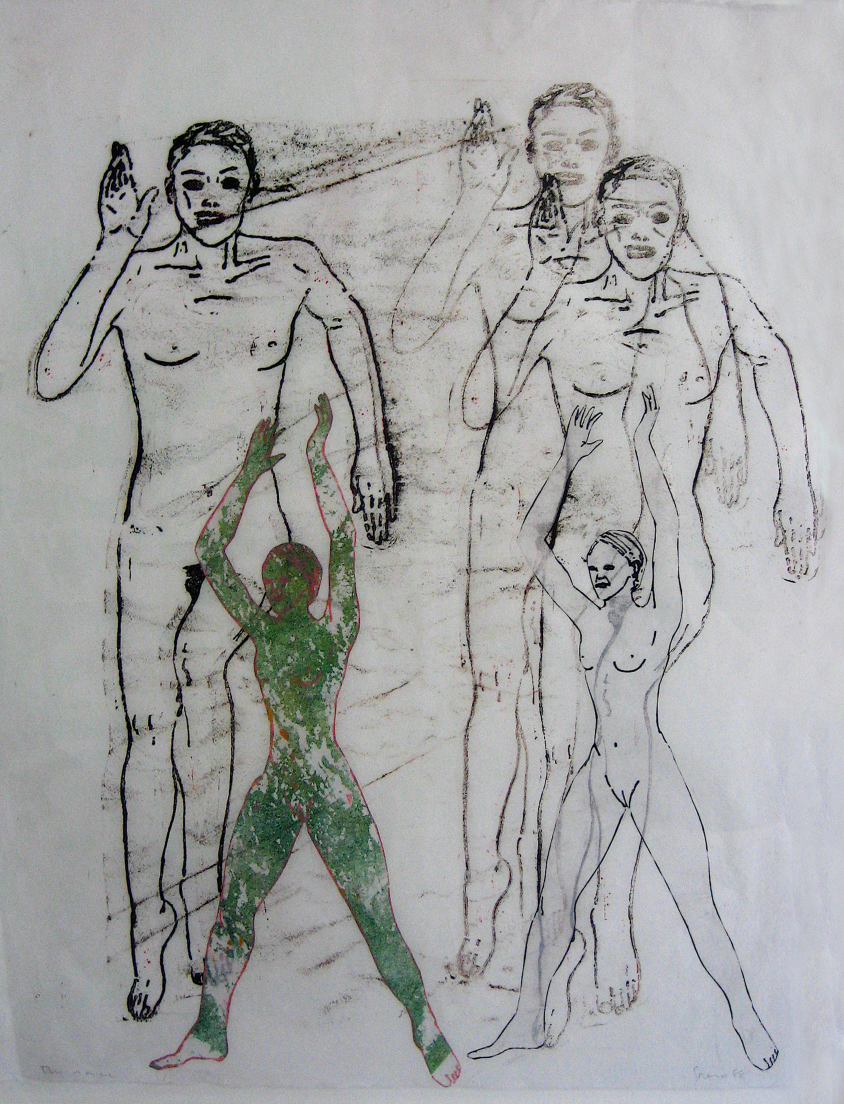 Developing a pictographic language of body gestures and motion, a bodily hieroglyphics, Spero reconstructed the diversity of representations of women from pre-history to the present. From 1976 through 1979, she researched and worked on Notes in Time on Women, a 20 inch by 210 foot paper scroll. She elaborated and amplified this theme in The First Language (1979–81, 20 inches by 190 feet), eschewing text altogether in favor of an irregular rhythm of painted, hand-printed, and collaged figures, thus creating her “cast of characters.” The acknowledgement of Spero’s international status as a preeminent figurative and feminist artist was signaled in 1987 by her traveling retrospective exhibitions in the United States and United Kingdom. By 1988, she developed her first wall installations. For these installations, Spero extended the picture plane of the scrolls by moving her printed images directly onto the walls of museums and public spaces.