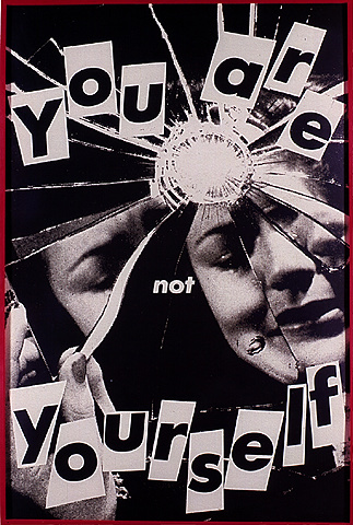 sources with pithy and aggressive text that involves the viewer in the struggle for power and control that her captions speak to. She develops her ideas on a computer, later transferring the results to often billboard-sized images. In their trademark white letters against a slash of red background, some of her instantly recognizable slogans read “I shop therefore I am,” and “Your body is a battleground.” Much of her text questions the viewer about feminism, consumerism, and individual autonomy and desire, although her black-and-white images are frequently culled from the mainstream magazines that sell the very ideas she is disputing.