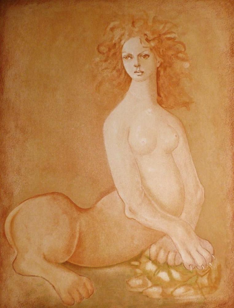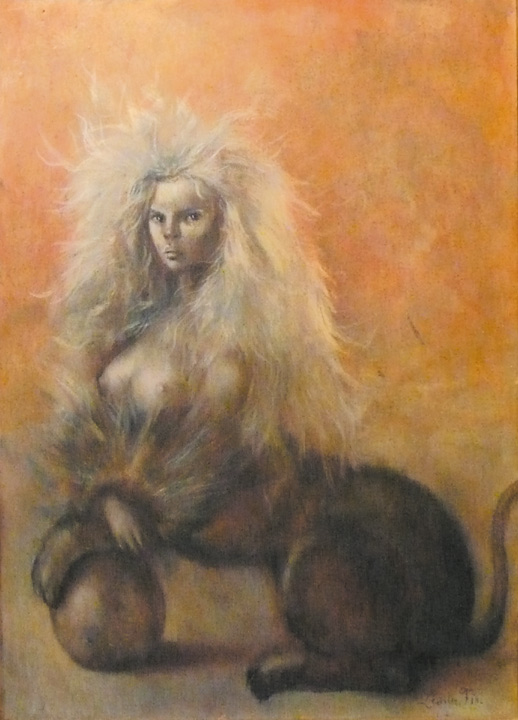It has been said about her that she is the only artist to paint women without apology. Many of her paintings feature strong, beautiful women (many times resembling herself) in ceremonial or provocative situations. Men are often portrayed as lithe figures who are under the protection of her females. The sphinx and cats play major parts in her paintings, as does the theme of ‘the double’. She was equally adept at etching, drawing, watercolor and oil painting. She lived with many cats; up to a total of 23 at one time. The illness of one of her cats could send her into a deep depression.