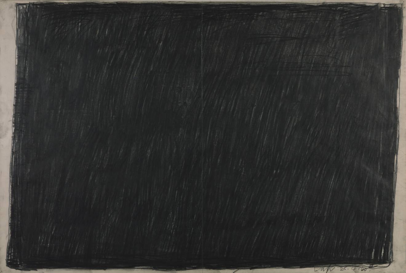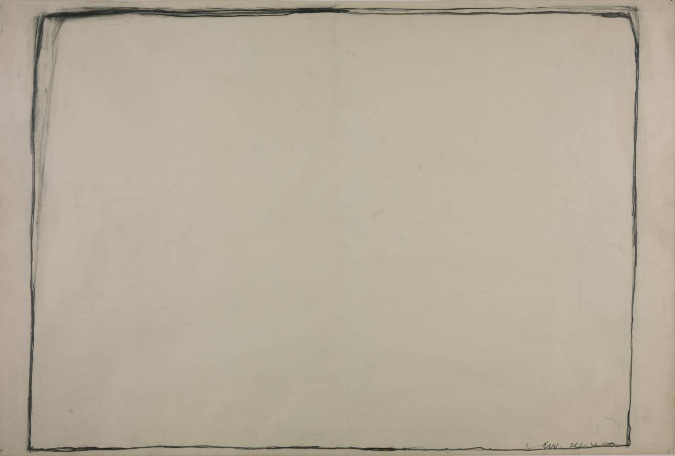 Bob Law’s artistic career started in the late 1950s when he moved to St.Ives. Inspired by the landscape, these seemingly simple outlines around the perimeter of the paper lead to a minimalist exploration of lines, shapes and forms. He was influenced in this direction by his discovery of the abstract paintings of Barnett Newman and Mark Rothko that he saw in 1959 at the Tate Gallery. Law then went on to make a series of black paintings out of different combinations of dark colours that were exhibited at the Museum of Modern Art Oxford in 1974.