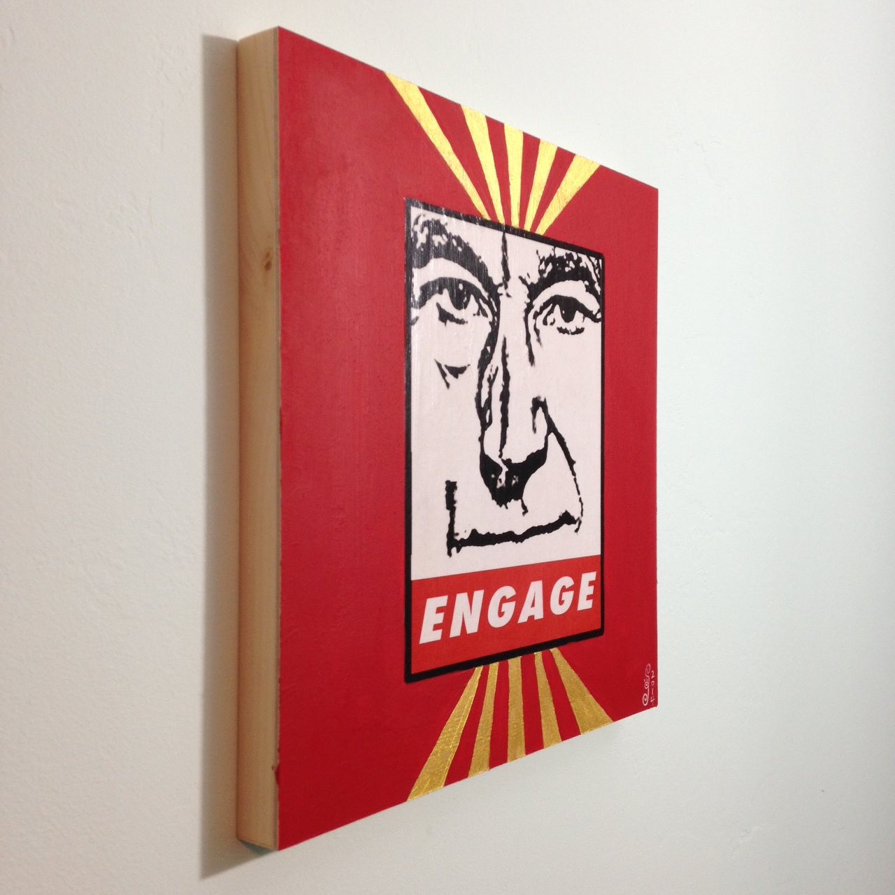 I wasn’t sure what I wanted to do for today’s piece. Something political? Ironic? Profound? Meaningful? After researching and staring at his art all morning, a random idea came to me. I even looked up the font for OBEY when researching this. I designed it in photoshop…which took quite a while and then decided to put it on a wood panel and paint the rest. At first I thought it’d be cool to make it look like a sticker that was pasted on a lamppost or fence, but then I opted for more color! Red and gold! What could be better than also paying tribute to the great Patrick Stewart/Jean Luc Picard? I hope you enjoy it and I’ll see you tomorrow on Day 140! Best, Linda