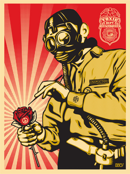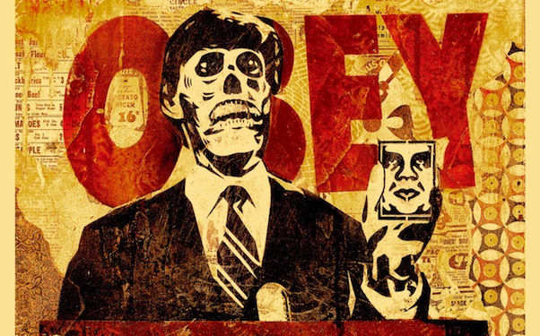 In a manifesto he wrote in 1990, and since posted on his website, he links his work with Heidegger’s concept ofphenomenology. His “Obey” Campaign draws from the John Carpenter movie They Live which starred pro wrestler Roddy Piper, taking a number of its slogans, including the “Obey” slogan, as well as the “This is Your God” slogan. Fairey has also spun off the OBEY clothing line from the original sticker campaign. He also uses the slogan “The Medium is the Message” borrowed from Marshall McLuhan. Shepard Fairey has also stated in an interview that part of his work is inspired by other street artists.