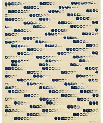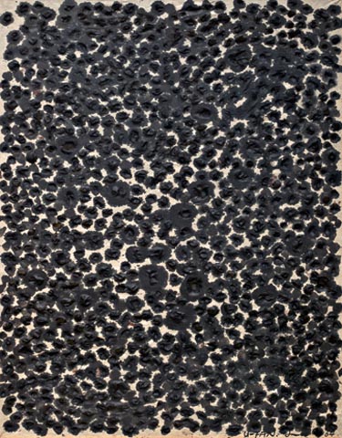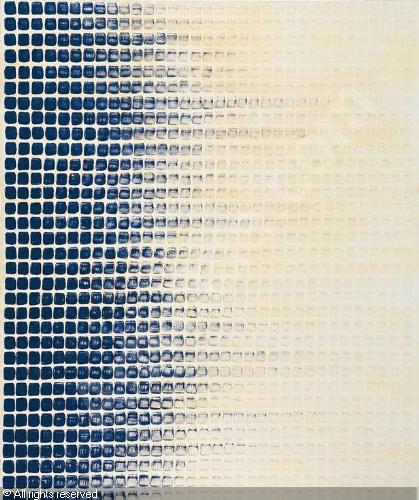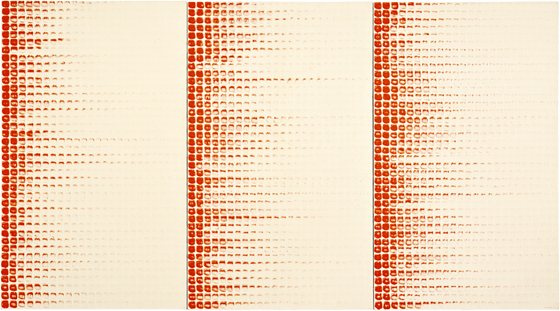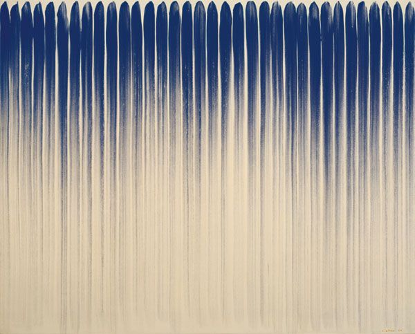 Where the brush first makes contact with the canvas, the paint is thick, forming a ‘ridge’ that gradually becomes lighter. Rarely does his brush touch the surface more than three times. The artist refers to this as yohaku or the art of emptiness. In the From Point works he adopted a similar method in order to produce a fading series of small, discrete, rectangular brushstokes.
