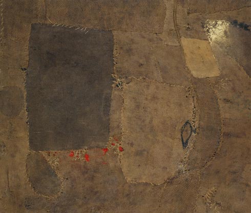 In the mid-1950s, Burri introduced charred wood into his burlap works, followed by