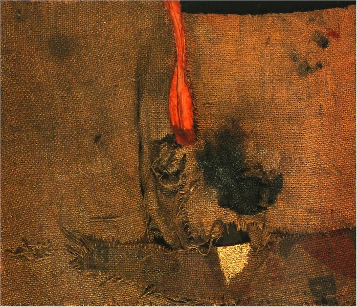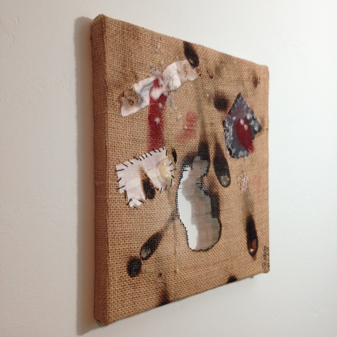 Mixed Media on Burlap (wax, medical tape, acrylic, thread, tape)