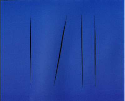Following his return to Italy in 1948 Fontana exhibited his first Ambiente spaziale a luce nera (Spatial Environment) (1949) at the Galleria del Naviglio in Milan, a temporary installation consisting of a giant amoeba-like shape suspended in the void in a darkened room and lit by neon light. From 1949 on he started the so-called Spatial Concept or slash series, consisting in holes or slashes on the surface of monochrome paintings, drawing a sign of what he named “an art for the Space Age”. He devised the generic title Concetto spaziale (‘spatial concept’) for these works and used it for almost all his later paintings. These can be divided into broad categories: the Buchi (‘holes’), beginning in 1949, and the Tagli (‘slashes’), which he instituted in the mid-1950s