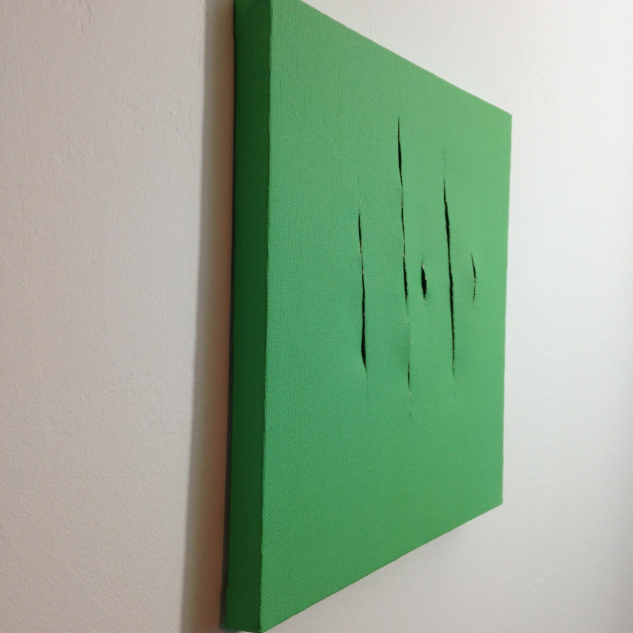 I basically asked my husband to give me a color and then I painted the canvas and slashed it with a blade. I did choose my slashes carefully for some reason. It was an interesting experience and somewhat fun to slash it…”almost” as fun as burning. 😉 I do wish I did this with a sharper blade…it is a little rough around the edges. I hope you enjoy my piece and I’ll see you tomorrow on Day 159! Best, Linda
