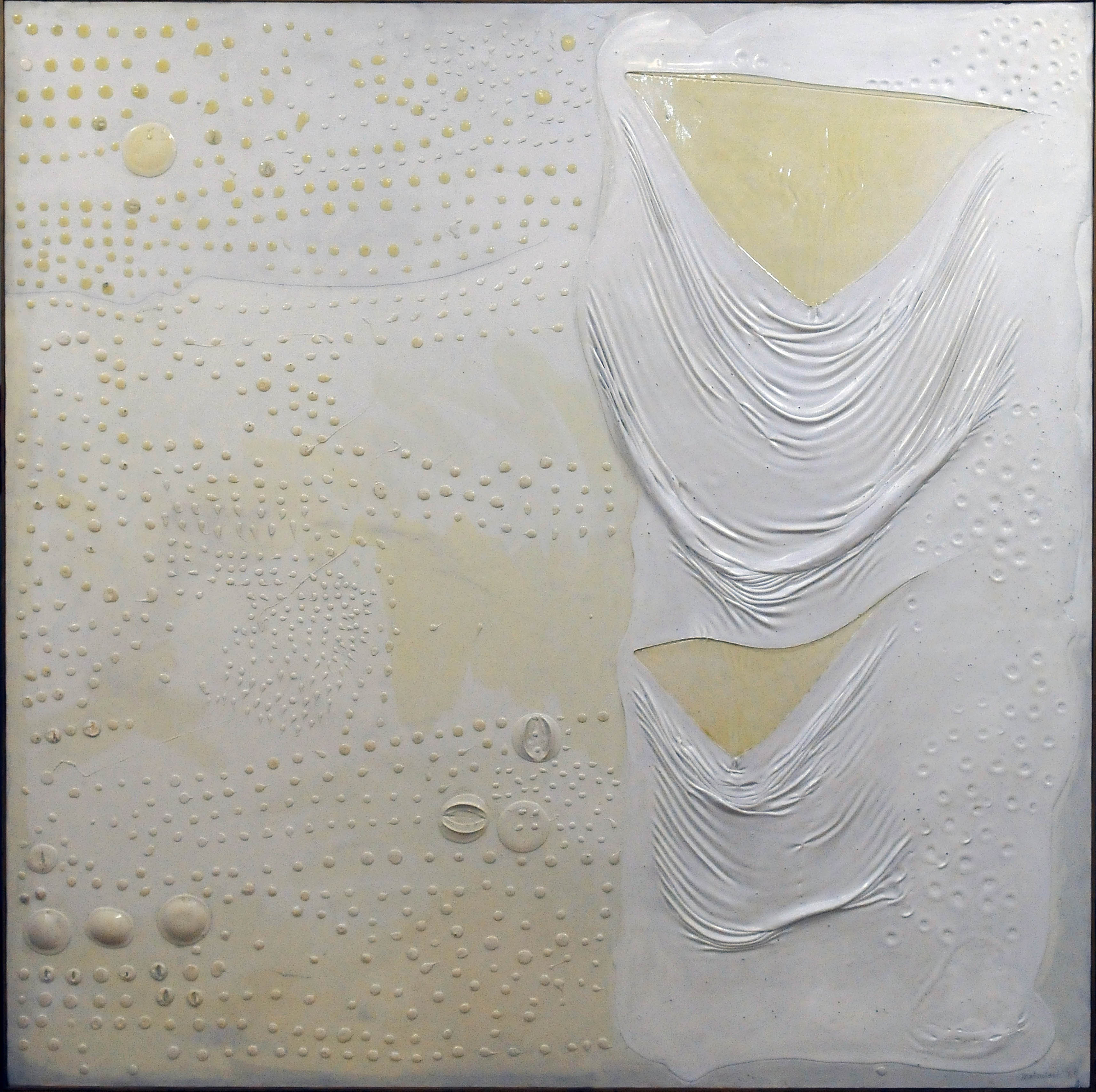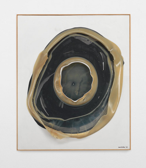 Japanese manufacturers started producing after the war. Allowing the glue to drip slowly, he created stalactitelike forms on the surfaces of canvases. Motonaga introduced the younger artist to Yoshihara, to whom Matsutani showed his dripped-glue concoctions, but the Gutai leader was not impressed. Had Matsutani intervened too much in the making of his experimental works and not allowed the materiality of his glue to reveal or express itself in its own ways? Had he somehow failed to grasp and convey the true spirit of Gutai art? These were the questions Matsutani asked himself as he returned to his studio to experiment some more. Inspired, in part, by the organic shapes in blood samples he had viewed under a microscope at a friend’s laboratory, Matsutani went on to develop circular, bubblelike forms from blobs of vinyl glue that he deposited on the surfaces of canvases. In these experiments, he noticed that the outer surface of the glue became a thin, stretchy film as it slowly hardened. With a narrow straw, Matsutani could pierce the drying glue bubbles and blow air into them, crafting bulbous shapes that sometimes popped and collapsed. Once dry, these elements suggested the shells of strange sea creatures or the curves of the human body—or, more precisely, female genitalia. “Working with vinyl glue, I quickly discovered its sensual quality and from then on I would always strive for a certain sensuality in my work, coming from the materials themselves,” Matsutani recalls.