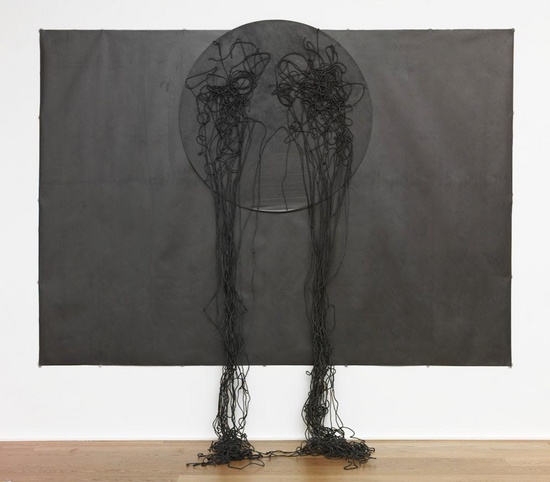 has been presenting for several years. Called Relation, it consists of a cloth-covered plastic bag filled with black ink that is suspended about 6 feet above a sheet of canvas stretched on a rectangular frame, which also hangs from the ceiling, about 4 feet above the ground. Beneath it is a shallow, water-filled metal pan the same size and shape as the canvas. To start the piece, the artist pricks small holes in the bag, allowing the thick ink to drip onto the canvas. As the fabric becomes saturated, the ink drips through it into the pan below, darkening the pool of water. Nearby, one of Matsutani’s enormous graphite drawings cascaded down to sprawl along the floor, setting up a contrast—or “relation”—between its blackness (and the manner in which it was achieved) and the black-splattered, self-creating painting-in-progress. The side-by-side pieces, which functioned both separately and together, gave viewers a sense of the inherent drama and discipline that are to be found in Matsutani’s art, from the predictably unpredictable nature of a work that can be seen creating itself to the daunting size of a handmade piece whose craftsmanship is as obsessive as it is precise.