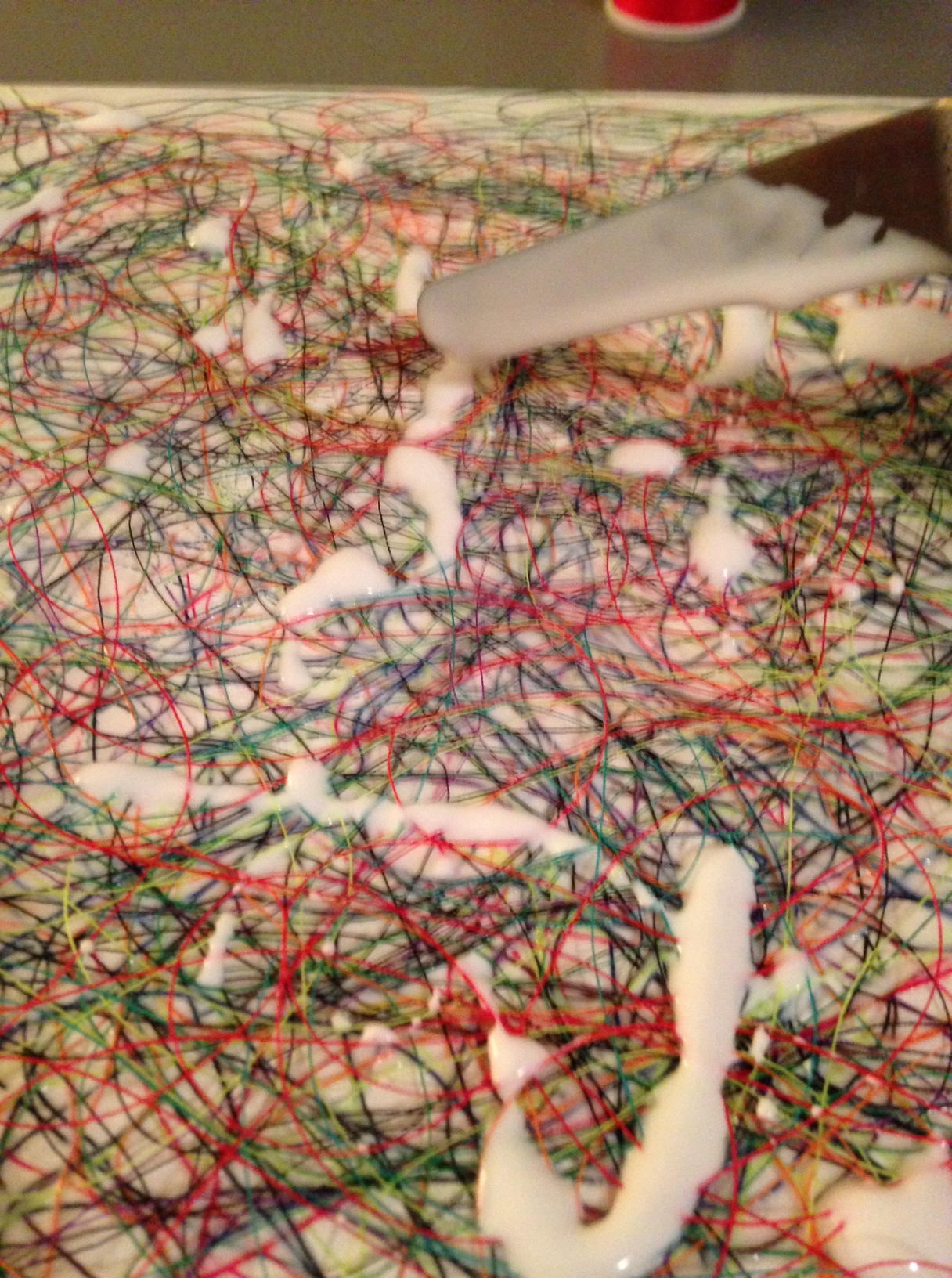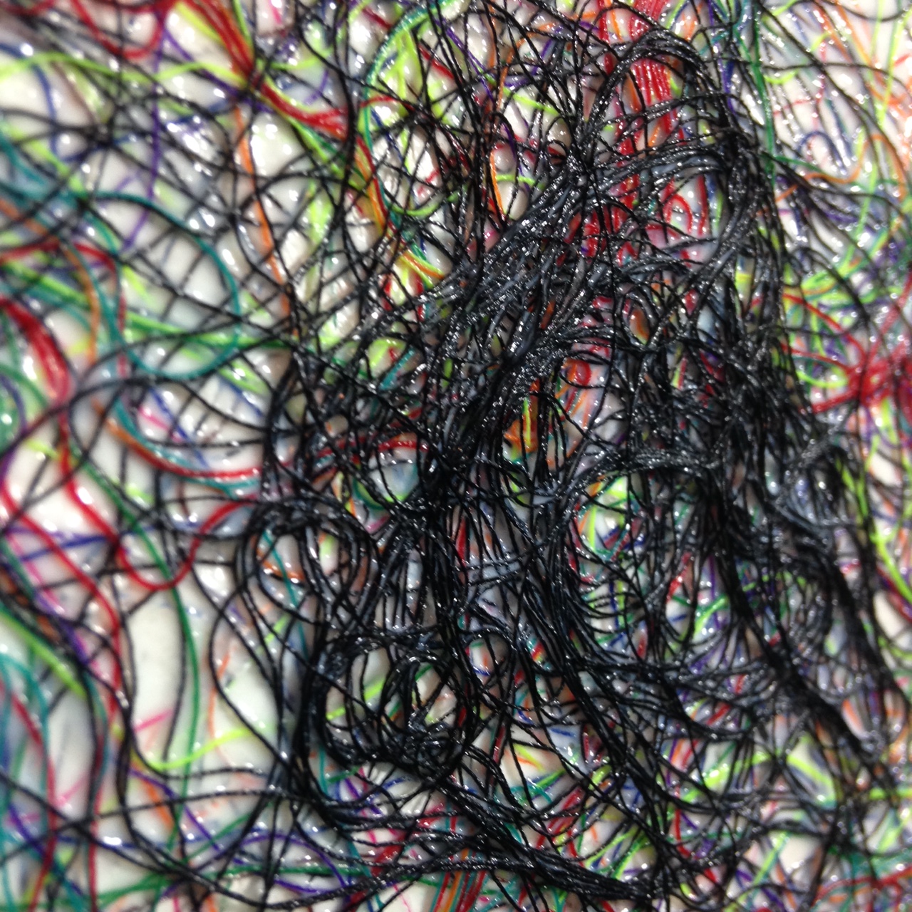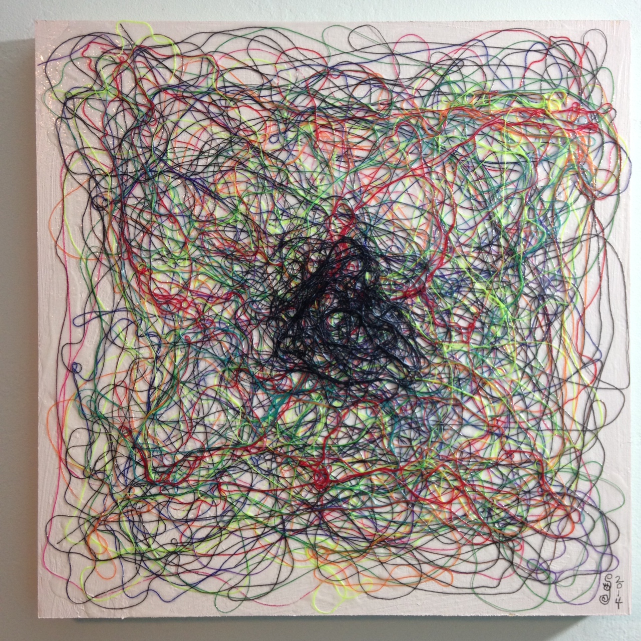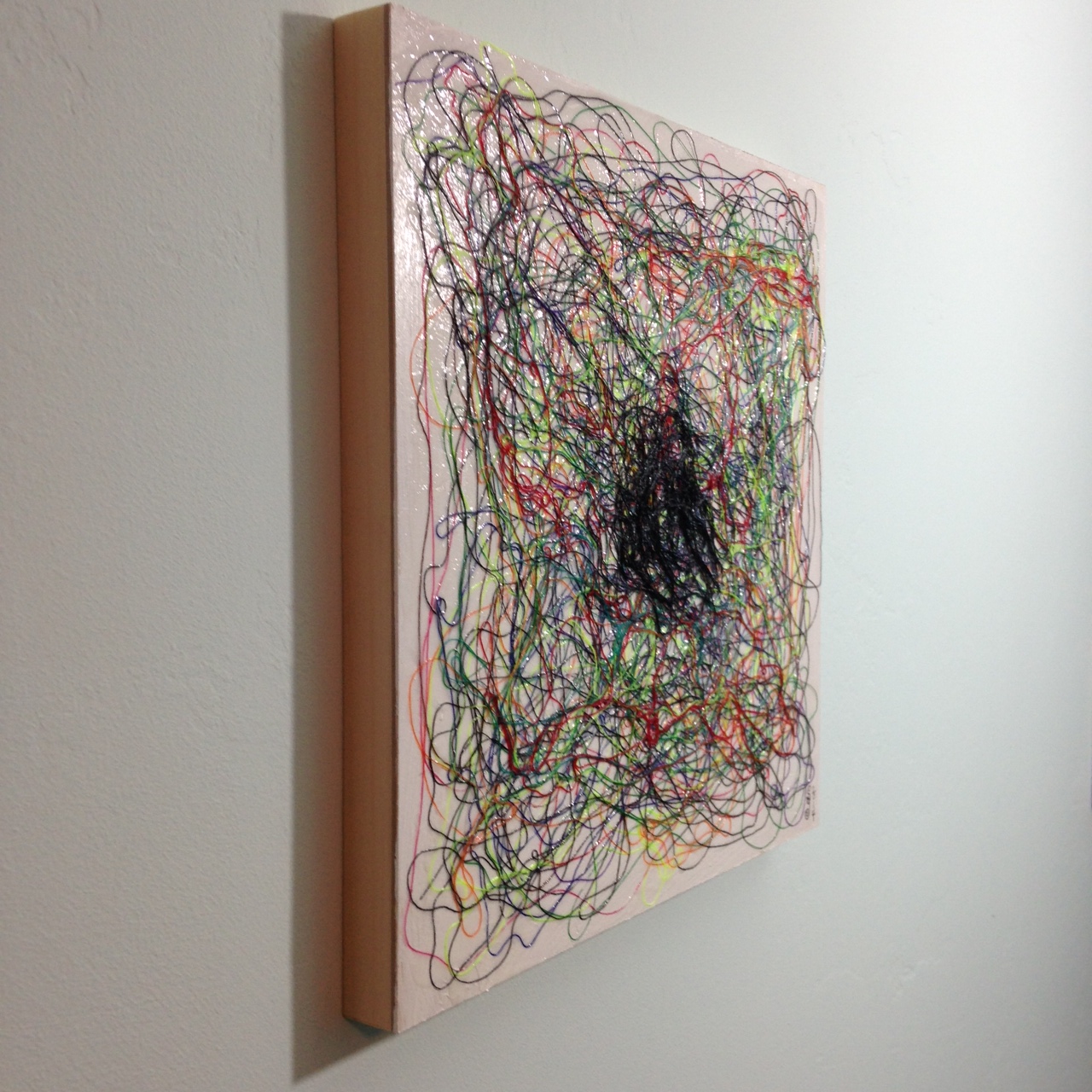 I started with colored thread onto a painted white wood panel and then started spilling it onto the surface. I then started adhering it onto the panel with
