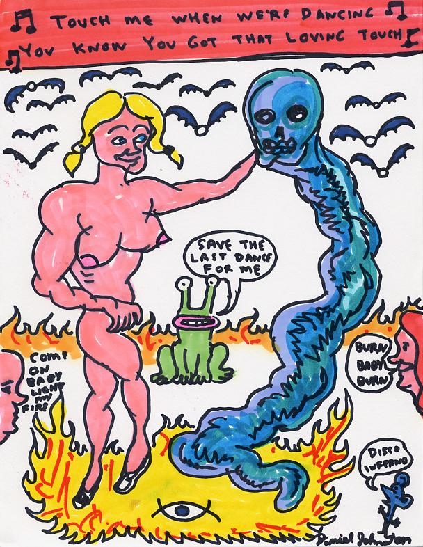Interest in Johnston increased when Kurt Cobain was frequently photographed wearing a t-shirt featuring the cover image of Johnston’s album Hi, How Are You which music journalist Everett True gave him. Kurt Cobain listed Yip/Jump Music as one of his favorite albums in his journal in 1993. In spite of Johnston being resident in a mental hospital at the time, a bidding war to sign him ensued. He refused to sign a multi-album deal with Elektra Records because Metallica was on the label’s roster and he was convinced that they were of Satan and would hurt him. He also dropped his manager after having a psychotic episode at a Butthole Surfers concert. His manager, Kramer, called Johnston’s parents after the episode and was in turn fired because he thought: “they’ll put me in a looneybin”. Ultimately he signed with Atlantic Records in February 1994 and that September released Fun, produced by Paul Leary of Butthole Surfers. It was a commercial failure. In June 1996, Atlantic dropped Daniel from the label.