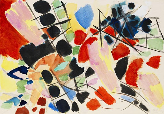 “Augenbilder”. A first one-man-show in America at the Kleeman Galleries, New York, in 1955, participation in the 1956 Venice Biennale and the Kassel documenta (1955, 1959 and 1964) are milestones marking Nay’s breakthrough on the international art scene. Ernst Wilhelm Nay was awarded important prizes and is represented by work in nearly all major exhibitions of German art in Germany and abroad. The first English-language monograph of Nay’s work was published by Ridinghouse in 2012.