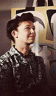 work. She credited Mondrian, who had arrived in the United States in the fall of 1940, with inspiring her to abandon biomorphism and adopt “straight-edged” shapes.(5) Under his influence, shedeveloped theories about “displacement” and “four-way balance”, apparent in her increasing decentralization of image and use of an all-over compositional approach.(6)