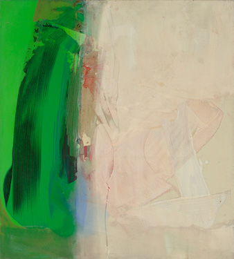 Frank Wimberley is no stranger, of course, to those who follow the heritage of Abstract Expressionism. The 26 paintings on exhibit here, spanning 13 years of work, intelligently arranged by Helen Spanierman, show what the buzz is all about. Wimberley is a fine Fine Artist – his acrylics and mixed media acrylics on canvas constituting dynamic free-form geometries of seductive tactility and fascinating color combinations. Viewers will be hard pressed not to touch the works where clots and elongated concentrations of pigment embellish the entire surface or where brushstrokes, heavy with paint, smear across and down, leaving raised side track marks in their wake. Which is to say, most of the works here, though not all.