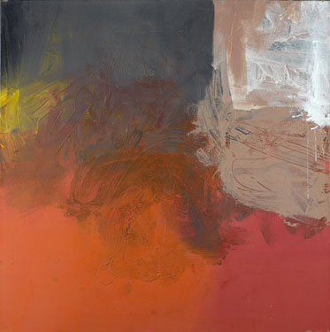 Several pieces, such as “Zest,” with its bold, uniform-orange L-shaped lower plane set dramatically against a top portion of yellow, gold and gray blue – essentially the same palette as “Flutter” and just as audacious a juxtaposition of colors and styles – announce their newness. On the other hand, the more manifest mixed collages here, where Wimberley has affixed small pieces of variously shaped cloth to the canvas, sometimes layering the materials and infusing pigments with sand and varnish – “Thrum and Lavinia” from 1997, and “Amber Plane” and “Into Jamaica” from 2000 – seem to belong to earlier days of more widely distributed pigment coagulations. The distinction may be forced, but the recent pieces seem bolder, even wild in execution, while at the same time the color range seems more restricted, or unusual. Sixteen of the 26 works on exhibit here were completed in the last two years.