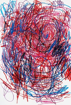 driven, is also an existential symbol of himself as an artistic figure, and it does not end in an area; much rather, three- and multi-dimensional phenomena are created as existing spaces are destroyed. Raving mad lines deconstruct existent spatial structures such as those in Venice and Linz, thus creating new, multi-layered spaces. For the Biennial, the artist produced condensed lines which were to counteract the concept of this large-scale exhibition with its honeycomb-like set-up of transit: space was to become a world in the minds of the beholders, at least for a few seconds before they proceeded through the exhibition maze.