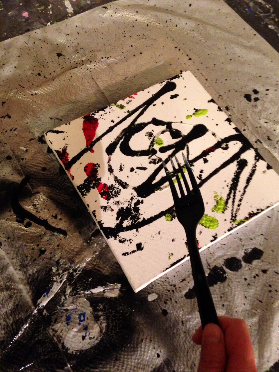 I hope you enjoy my piece today. I randomly poured 4 colors of paint then smashed a screen against it spreading the paint. I then used a fork to make random patterns with the paint. I like how it turned out. 🙂