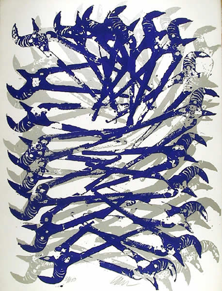 Early on, it was apparent that Arman’s concept of the accumulation of vast quantities of the same objects was to remain a significant component of his art. Ironically, he had originally focused more attention on his abstract paintings, considering them to be of more consequence than his early accumulations of stamps. Only when he witnessed viewer reaction to his first accumulation in 1959 did he fully recognize the power of such art. In 1962, he began welding together accumulations of the same kinds of metal objects, such as axes (as pictured below).