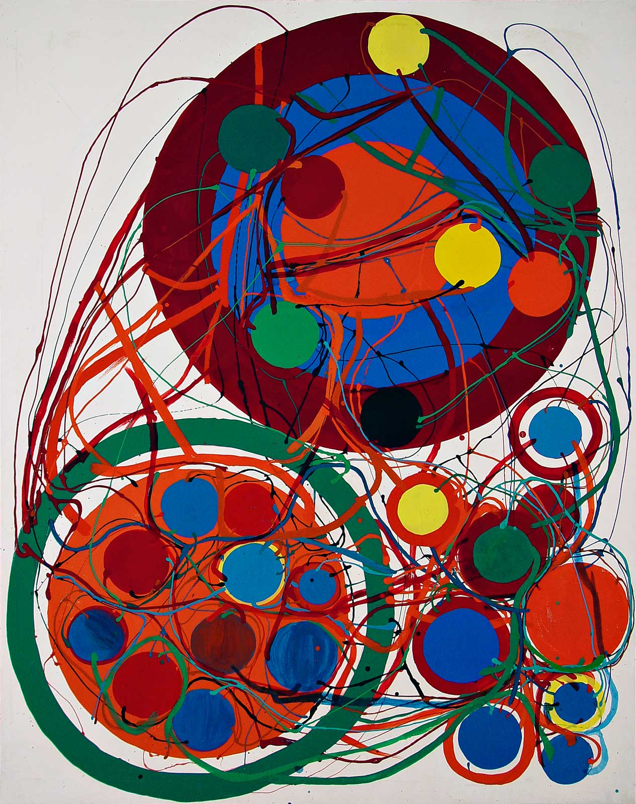 including that of New York’s Museum of Modern Art (MOMA). MOMA’s online collection (see external links) features a large, untitled 1964 Tanaka work (synthetic polymer paint on canvas). Nearly 12 feet (3.7 m) tall and over 7 feet (2.1 m) wide, this piece, according to MOMA’s online description, “evolved from Tanaka’s performance Electric Dress“, and “vividly records the artist’s gestural application of layers and skeins of multicolored acrylic paint on the canvas as it lay on the floor.”