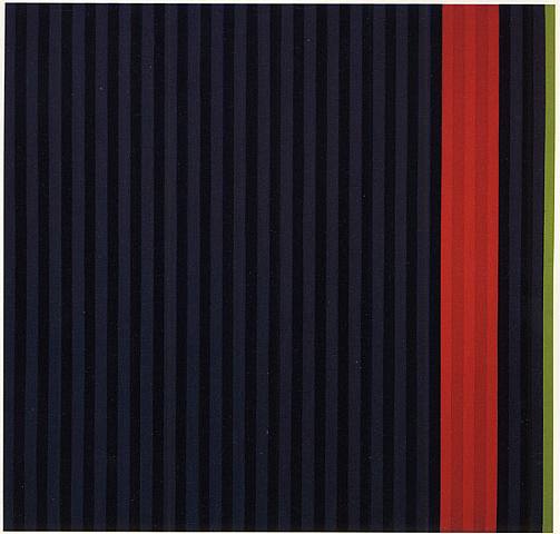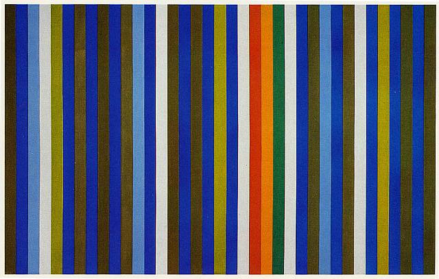 One of the best-known of his paintings, “Black Grey Beat” (1964), owned by the Smithsonian American Art Museum reinforces these musical comparisons in its title. The pairs of alternating black and grey stripes are repeated across the canvas, and recognizable even as other colors are substituted for black and grey, and returned to even as the repetition of dark and light pairs is here and there broken by sharply contrasting colors.