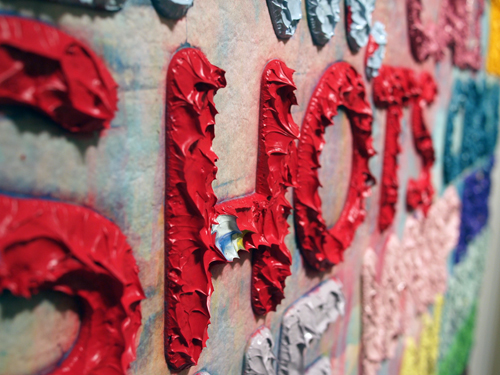 A survey of Mel Bochner’s work – entitled Mel Bochner: If the Colour Changes, was held at Whitechapel Gallery, London, Haus der Kunst, Munich and Museu de Arte Contemporânea de Serralves, Porto during 2012. Tracing nearly 50 years of work, this exhibition commences with Blah, Blah, Blah (2011) a huge painting that encapsulates Bochner’s ongoing fascination with language and with colour. The exhibition is