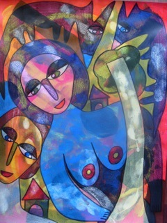 These strange forms, full origins are shrouded in a lunar light and sometimes surrounded by animals, boats, bicycles. Women on the necks of giraffes and powerful busts like trunks of mangrove, entwine their arms in arabesque their offspring. In this world of quiet tenderness, time hangs as to immobilize the creative moment that provides so much gratification that creator discreet.