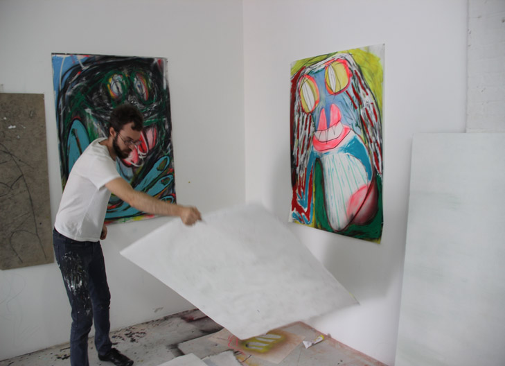 Natalie: In your studio, it looks like you have mockups of puppets made out of cardboard, you work on paper, you work on canvas, and you use a lot of different media. Could you define your style? Would you call it abstract, new abstract, post abstract, would you have a definition for the style of art that you do?
