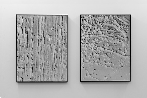based artist Michael Staniak, featuring paintings that seamlessly combine attributes of analog and digital processes. Although Staniak creates the paintings mostly by hand—he builds up texture with uneven layers of plaster and then paints the surface in a range of ways—the paintings bear an uncanny resemblance to flat digital prints. Indeed, one must view the works up close to perceive any texture or depth, and as such, they behave like contemporary trompe l’oeil paintings that baffle the senses. Some paintings do however utilize digital methods of output and in so doing create a dialogue between the two modes of production.
