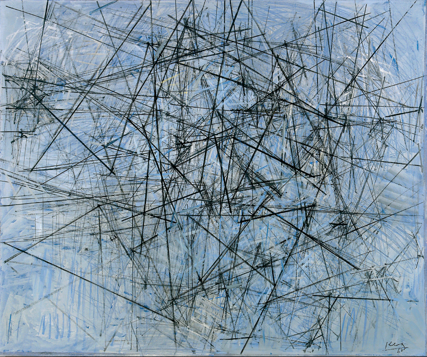 Inspired by Wassily Kandinsky and Paul Klee, Lenz Klotz developed a unique visual language of intersecting and oscillating lines, forming two-dimensional geometric figures reminiscent of calligraphy, musical scores, and other lyrical forms of notation.
