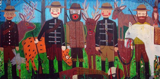 Composed for the gallery’s two exhibition spaces, “Hunter House” will present an installation of large-scale paintings and drawings, while “Bear Suit Number Two” is a continuation of “Barkostum” (or “Bear Suit”), the artist’s 2008 exhibition at Peres Projects Berlin. The latter draws its title from the figure of Timothy Treadwell, the eco-warrior, who spent thirteen summers living in dangerous proximity to grizzly bears in Alaska’s Katmai National Park.