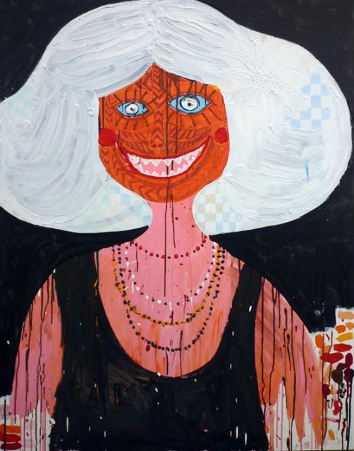 With broad, heavily layered brushstrokes and occasional thick drips depicting everything from lions and pixelated flowers to castles and ghosts, he underlies his subjects with repeating patterns (checkerboards, floral patterns, skulls) often executed in ink.